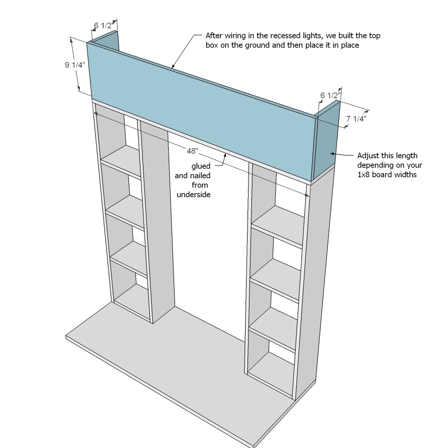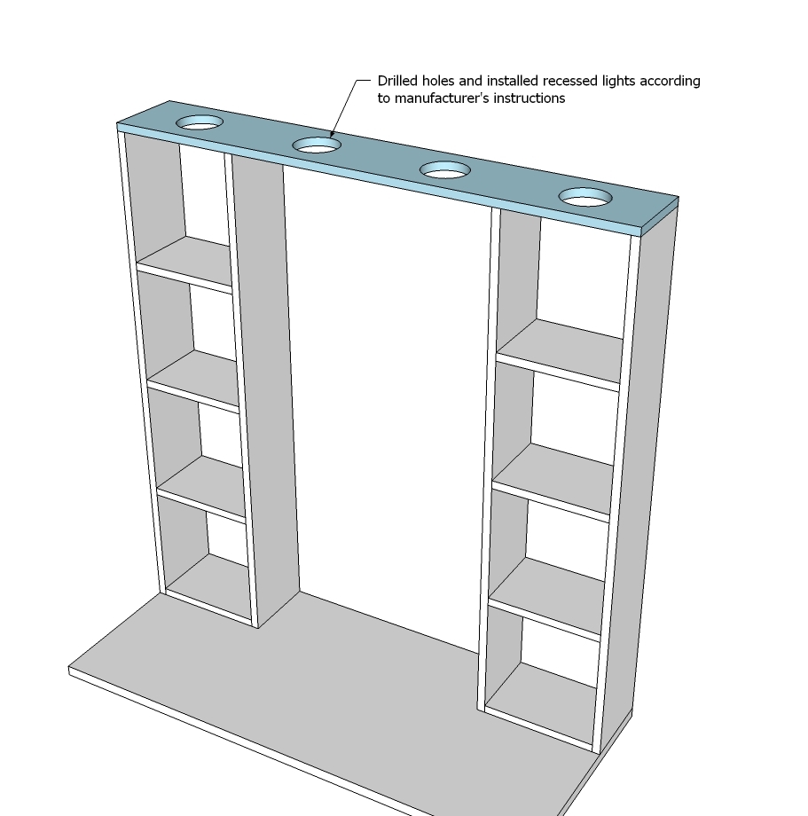 Kada su oba vertikalna tornja spremna, sledi izrada gornje ploče koja će ih povezati iznad ogledala i služiti kao platforma za našu ugradnu LED rasvetu. Izmerite razmak između vaših tornjeva (uzimajući u obzir širinu ogledala) i izrežite MDF ploču odgovarajuće dužine i širine (verovatno će biti nešto dublja od 1×8 kako bi lepo prekrila gornji deo tornjeva i imala dovoljno prostora za rasvetu). Sada dolazi uzbudljivi deo: planiranje pozicije svetala. Preporučujem četiri ugradne LED svetiljke za ravnomerno osvetljenje. Pažljivo izmerite i označite mesta gde ćete bušiti rupe za svetiljke. Koristite krunastu testeru odgovarajuće veličine za prečnik vaših ugradnih svetiljki. Bušite polako i precizno. Bitno je da su rupe čiste i bez krhotina. Ovo je detalj koji doprinosi luksuznom izgledu, zato ne žurite. Vaš cilj je da svetla budu savršeno simetrična i estetski prijatna. Preporučujem da unapred nabavite svetiljke, kako biste znali tačan prečnik i bili sigurni da će se savršeno uklopiti.