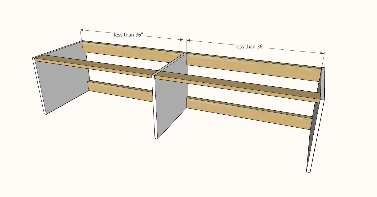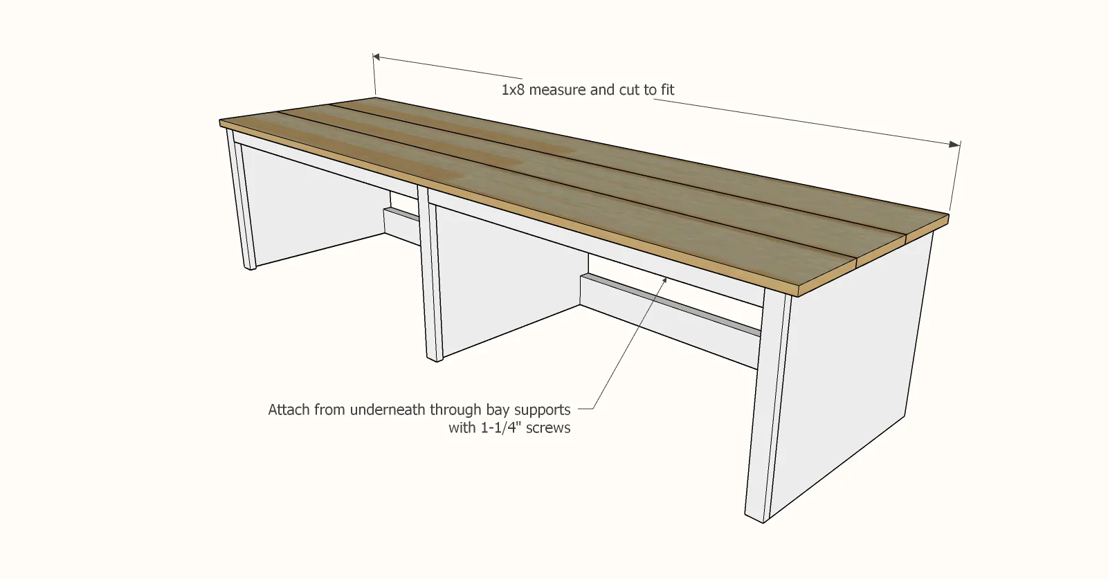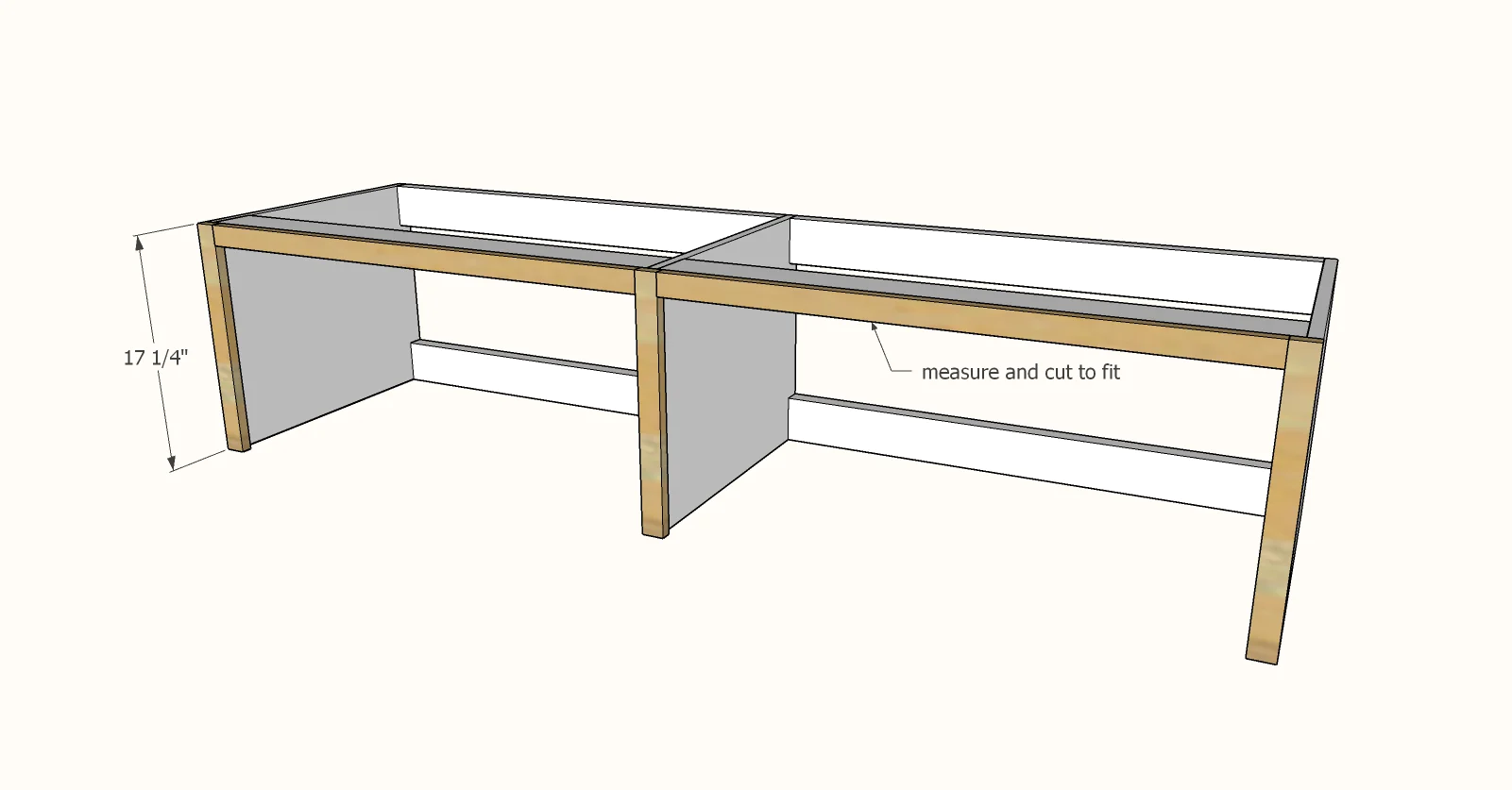 Rasporedite bay supports ravnomerno duž cele dužine klupe. Na klupi od 4,2 metra možete imati tri ili četiri ovakva ojačanja, u zavisnosti od željene čvrstoće i rasporeda. Pričvrstite ih unutar rama takođe lepkom za drvo i vijcima, pazeći da su savršeno vertikalni i u ravni sa prednjom i zadnjom ivicom rama. Ove pregrade ne samo da pružaju dodatnu strukturnu podršku, sprečavajući eventualno ugibanje gornje ploče, već i pomažu u definisanju vizuelnih segmenata klupe, dajući joj poliran i ugradan izgled. Dve priložene slike jasno ilustruju proces sastavljanja rama i dodavanja ojačanja, pružajući vam vizuelni vodič za svaki korak. Pažljivom izradom ovog “carcass” rama obezbeđujete temelj za dugotrajnu i stabilnu ugradnu klupu.